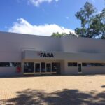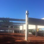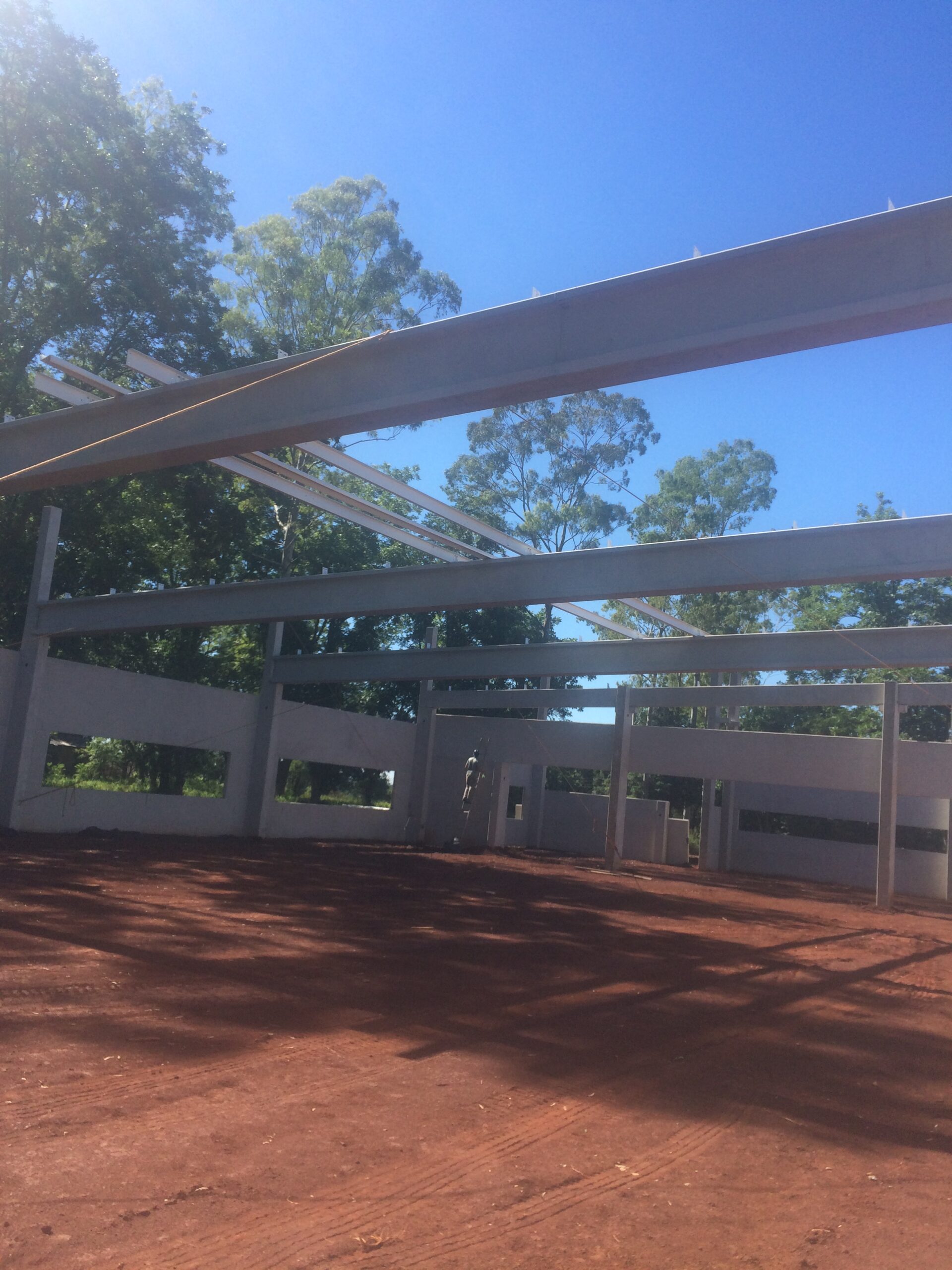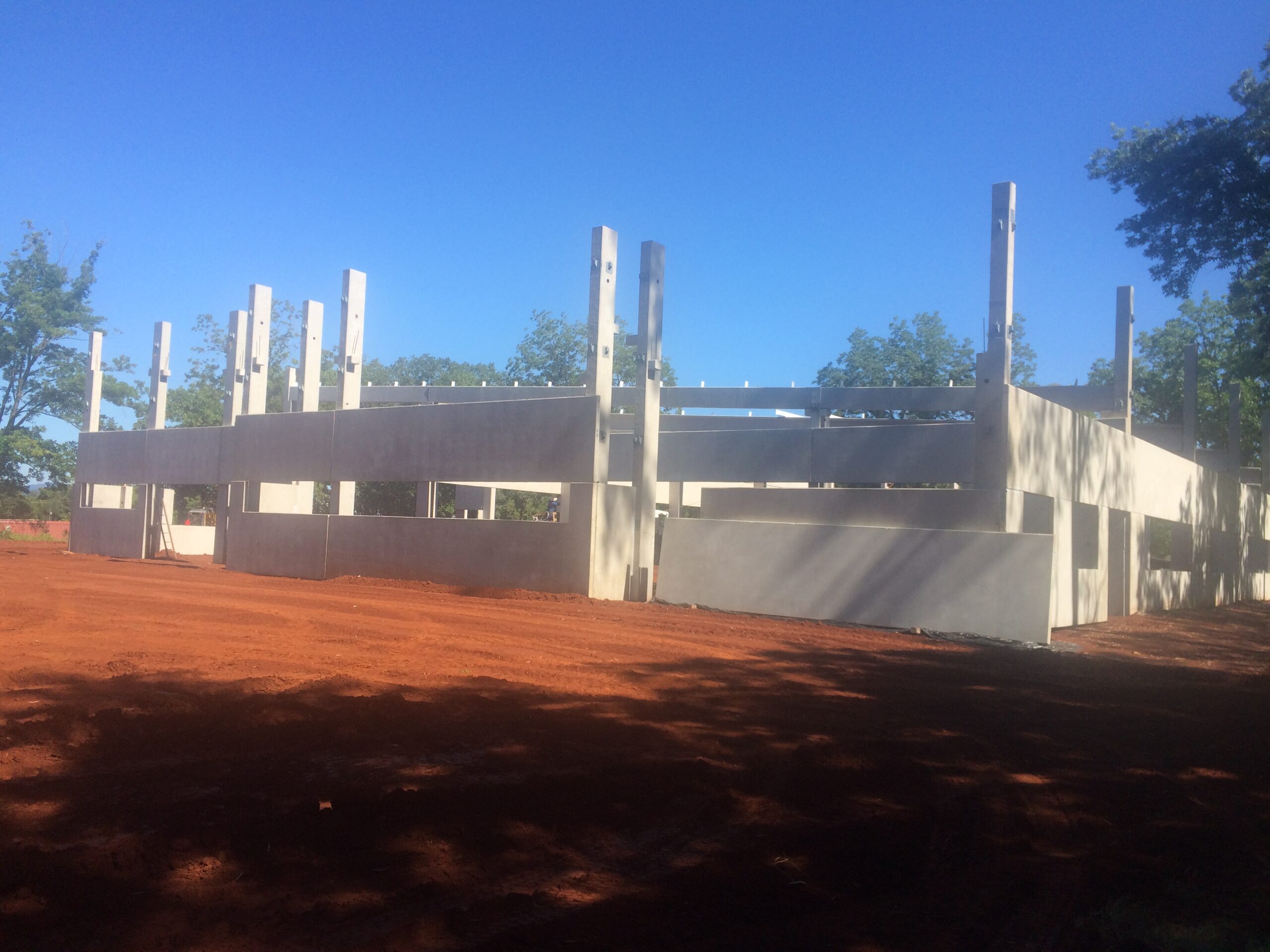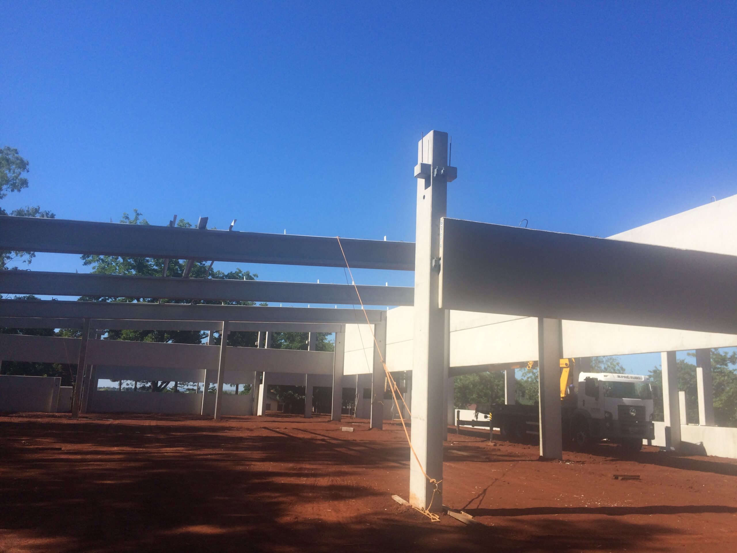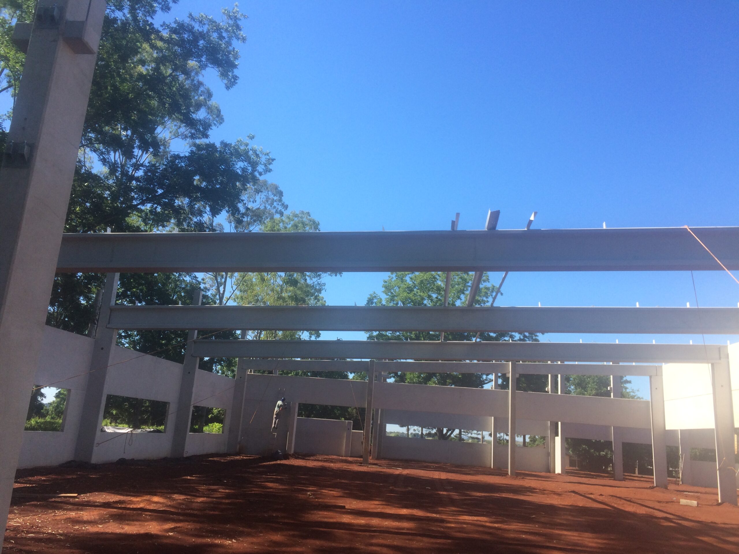 Estrutura pré-fabricada para escritório com mezanino. Foram utilizados, pilares vigas armadas e protendidas, lajes alveolares, parede pré-moldada e a cobertura com telha zipada termo acústica.
