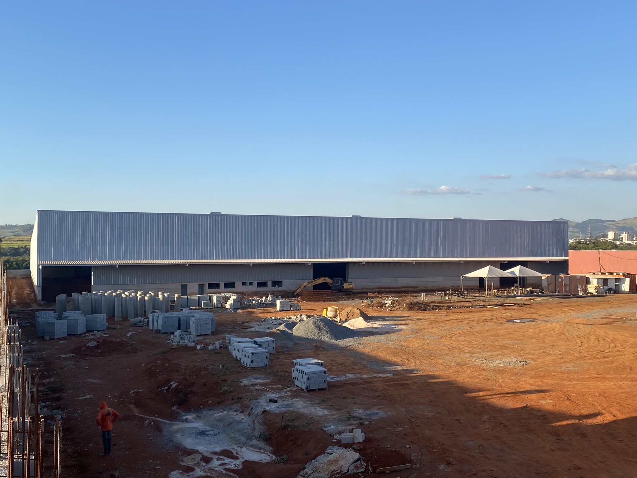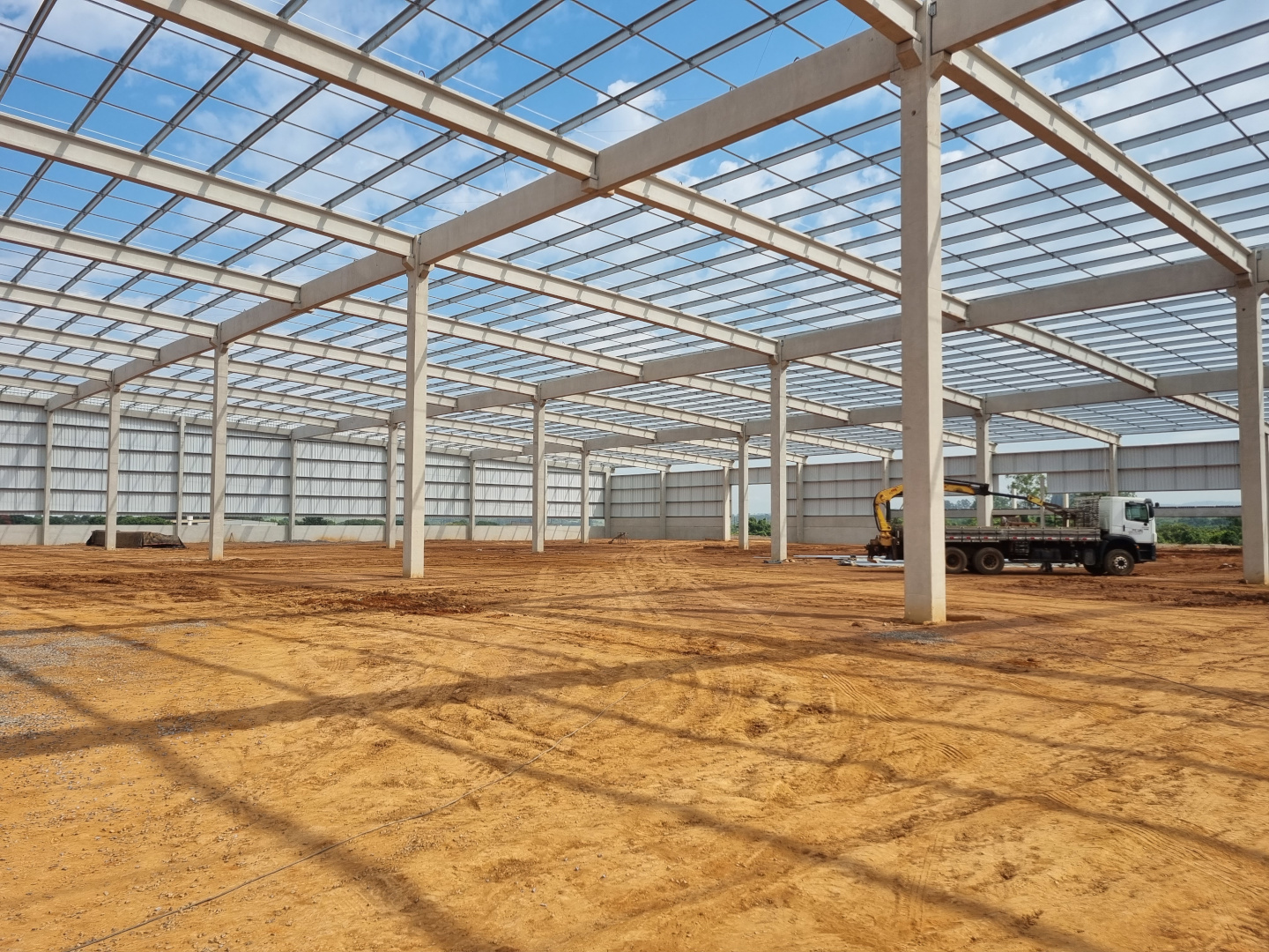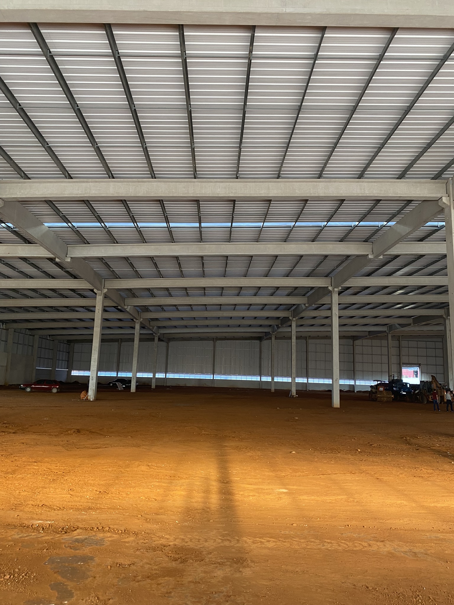Obra Pré-moldada com área total de 8.889,80m² sendo pavilhão principal mais marquises, a obra tem uma largura de 80,61m e comprimento de 101,00m, contempla uma cobertura compostas por Vigas de concreto protendido de 24,00m, terçamento metálico e telhas zipadas térmicas com Lanternim, São 10,00m de pé-direito e com fechamentos laterais em telhas. Mantendo o nosso padrão de qualidade e seguindo sempre as necessidades do cliente em ter uma obra com o menor número de pilares internos e com a cobertura em concreto, obtivemos vãos livres internos de 20,00m x 24,00m.